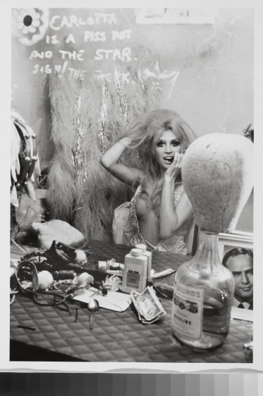 1. Carol Spencer AM (b.1943), known as Carlotta, is a cabaret performer, television personality and LGBTIQ+ advocate. Known as the “Queen of the Cross”, Carlotta joined Les Girls in 1962 and soon became the star, performing for almost three decades. In 1973, Carlotta was the first transgender person in the world to play a transgender character on television in the Australian series Number 96, and was one of the inspirations for the 1994 film Priscilla, Queen of the Desert. She was immortalised in the 2014 film Carlotta. This glamorous image of Carlotta, taken by photographer Rennie Ellis in the dressing room of Les Girls, was part of a series capturing the “surface glitter and underground guts” of Kings Cross.